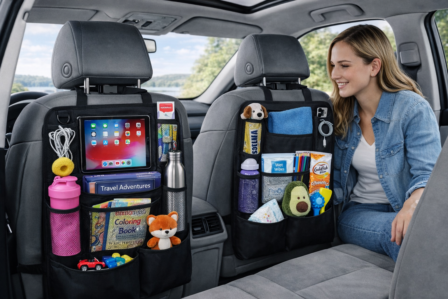 Keep your car clean, organized, and clutter-free with this Backseat Car Organizer. Designed with multiple storage pockets and a clear tablet holder, it helps you store travel essentials, toys, snacks, water bottles, books, and more while protecting your car seats from dirt and scratches.